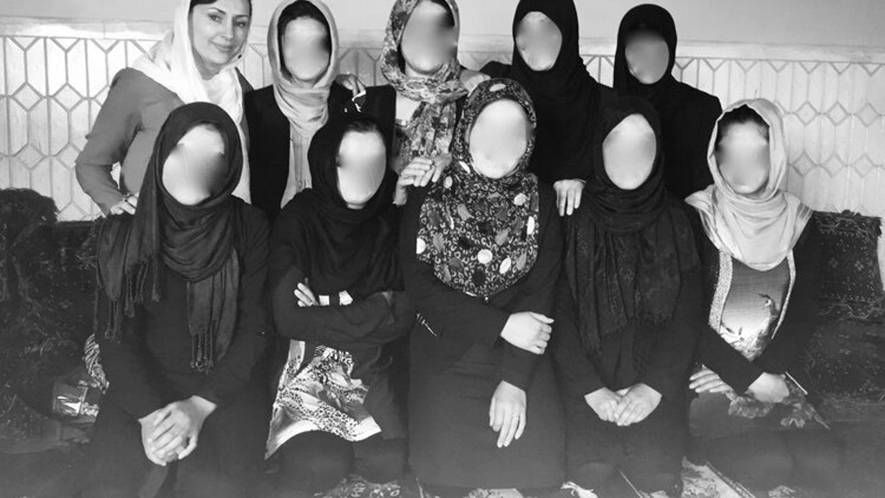 Humaira Ghilzai pictured with female scholars (whose faces are blurred) in Kabul under the Taliban regime.