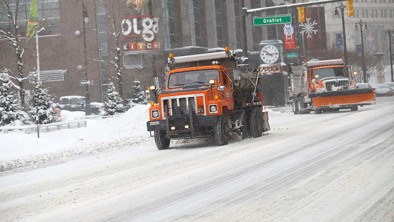 FILE - Snow plows clear several inches of snow and drop salt along Woodward Avenue in Detroit, Michigan.
