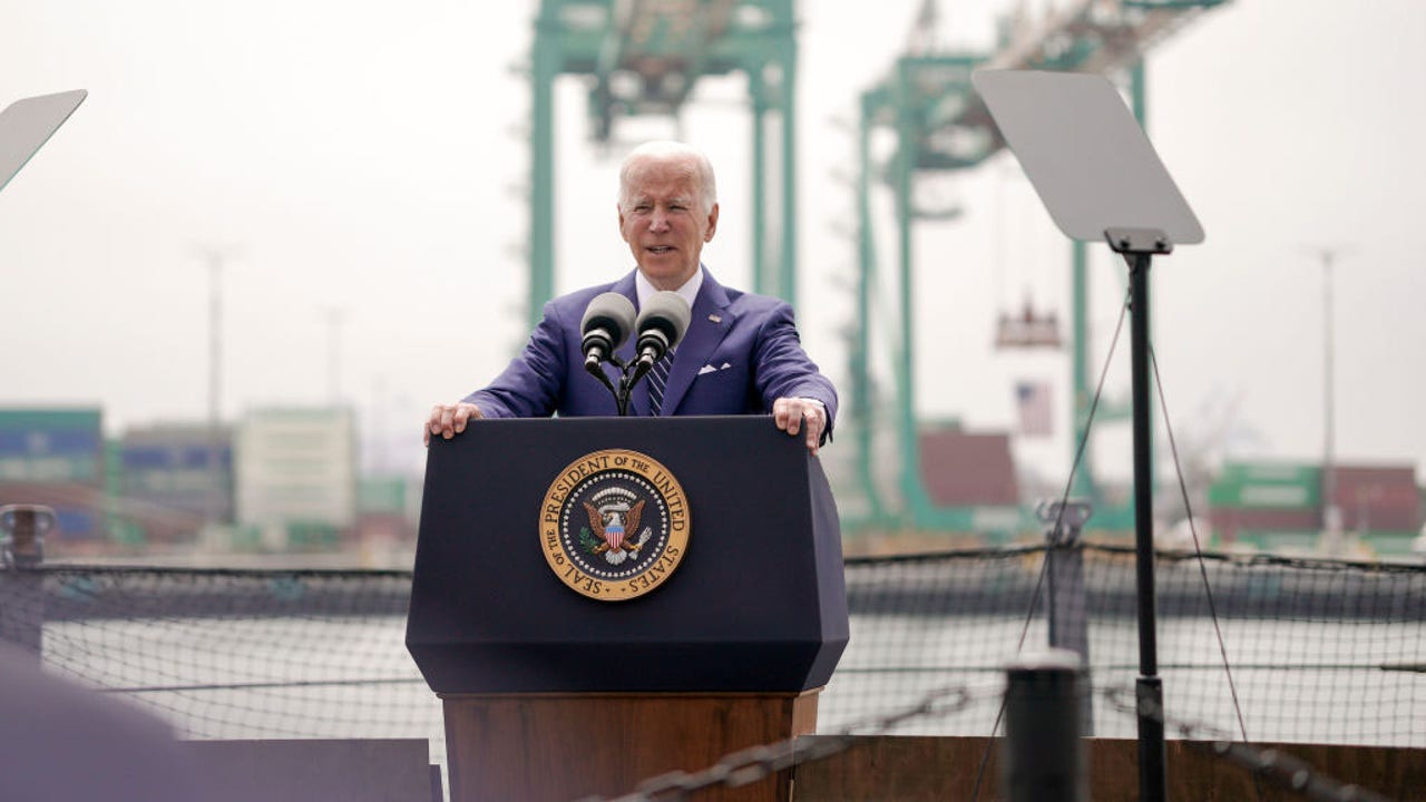 US President Joe Biden speaks at the Port of Los Angeles in Los Angeles, California, US, on Friday, June 10, 2022. Photographer: Kyle Grillot/Bloomberg via Getty Images