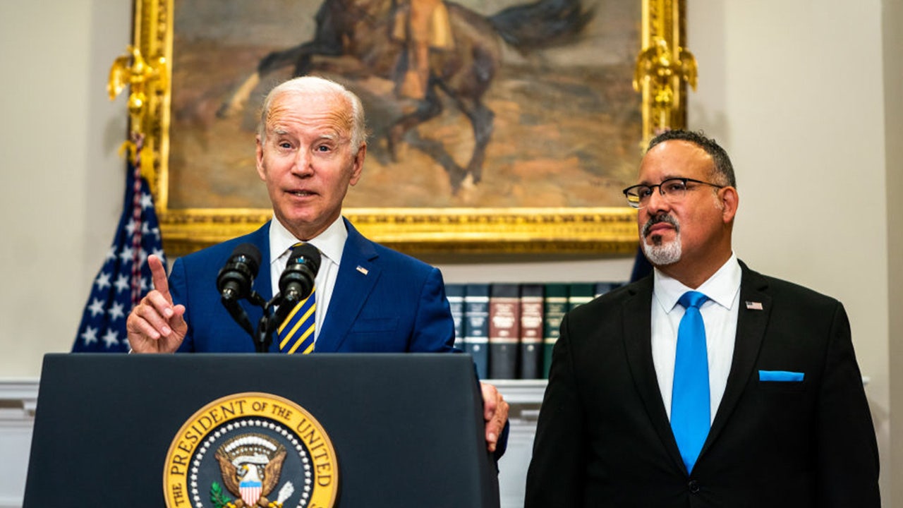 FILE - President Joe Biden delivers remarks regarding student loan debt forgiveness in the Roosevelt Room of the White House on Wednesday, August 24, 2022. Education Secretary Miguel Cardona joined. (Demetrius Freeman/The Washington Post via Getty Images)