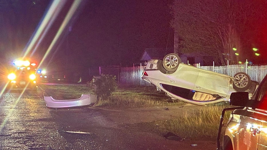 Car ends up overturned in front yard after pursuit in Mustang Ridge