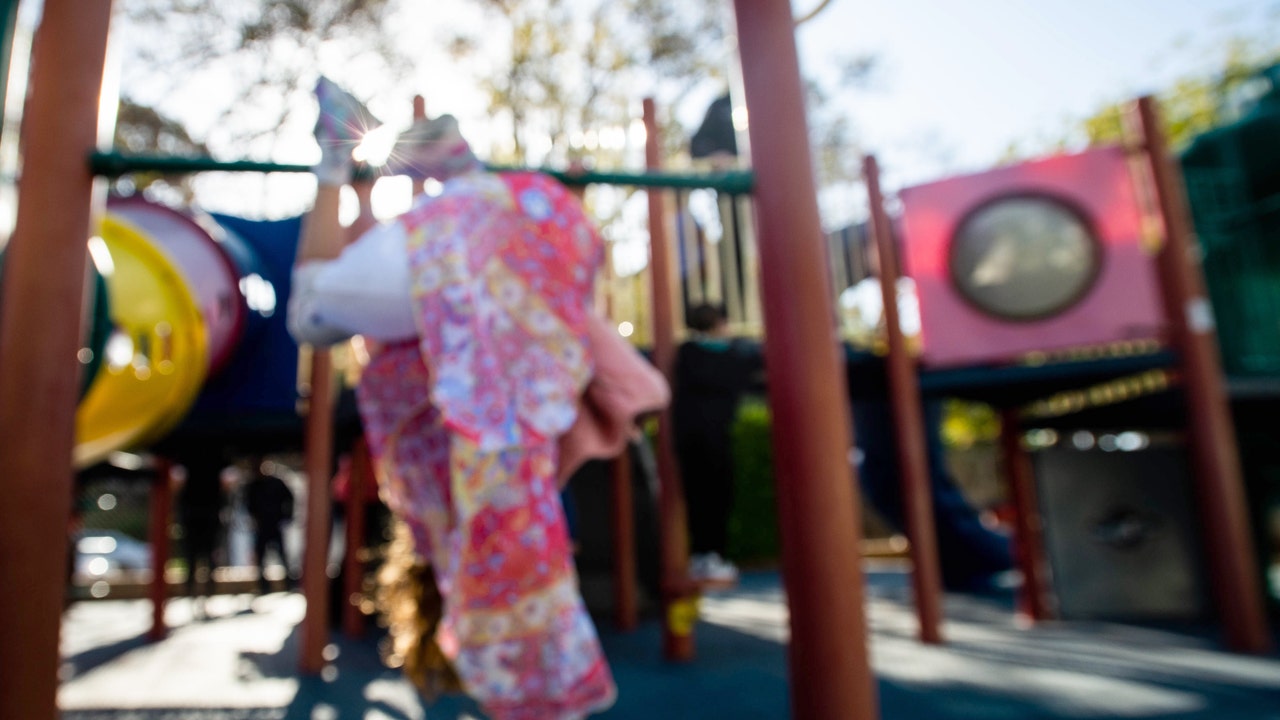 BRENTWOOD, CA - MAY 03: Robin Heilweil, 6, swings around with her kindergarten class at Kenter Canyon School in Brentwood during the reopening of playgrounds at early education centers and elementary schools across the district on Monday, May 3, 2021