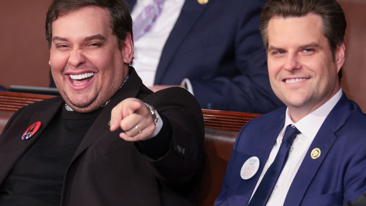 WASHINGTON, DC - MARCH 07: Former U.S. Rep. George Santos (R-NY) (L) sits with Rep. Matt Gaetz (R-FL) at U.S. President Joe Biden's State of the Union address during a joint meeting of Congress in the House chamber at the U.S. Capitol on March 07, 2024 in Washington, DC. This is Biden’s last State of the Union address before the general election this coming November. (Photo by Win McNamee/Getty Images)