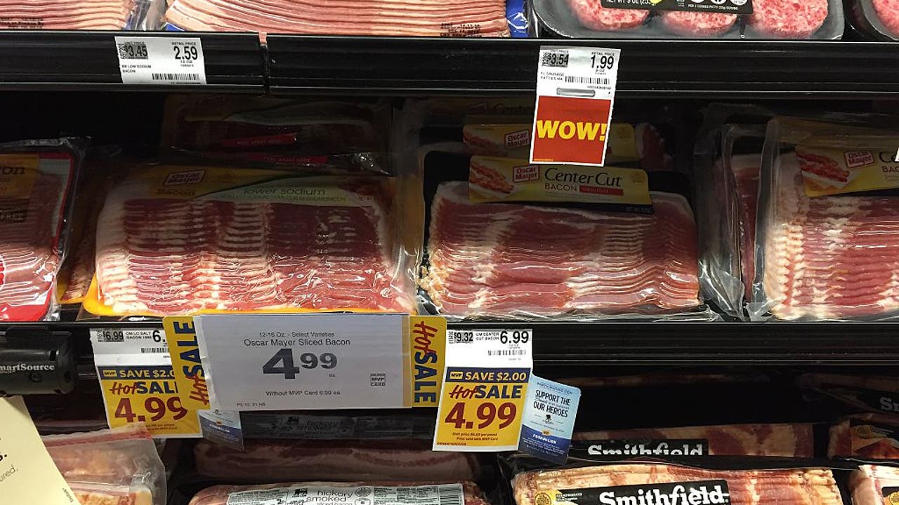 Packages of bacon are displayed on a a shelf for sale at a grocery store in Centreville, Maryland on October 26, 2015. Sausages, ham and other processed meats cause bowel cancer, and red meat "probably" does too, a UN agency warned Monday, in a poten