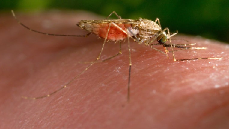 FILE - Anopheles gambiae mosquito feeding on a human host, close-up view, 2004. (Photo by Smith Collection/Gado/Getty Images)
