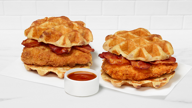 The chicken & waffles sandwiches will have a maple waffle, applewood smoked bacon, honey butter spread, and a side of syrup. They will be offered in original and spicy.