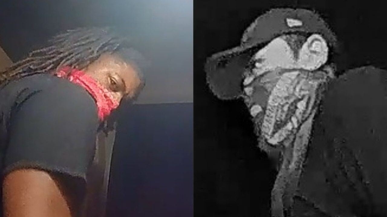 Suspect #1 is described as a Black male with a dreadlock hairstyle, wearing a red bandana, black t-shirt, red Adidas pants, black shoes, and black rubber gloves. He was carrying a black duffle bag.
