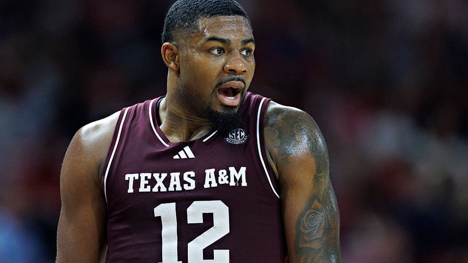 FAYETTEVILLE, ARKANSAS - FEBRUARY 24: Rashaun Agee #12 of the Texas A&M Aggies talks on the court during a game against the Arkansas Razorbacks at Bud Walton Arena on February 24, 2026 in Fayetteville, Arkansas. The Razorbacks defeated the Ag
