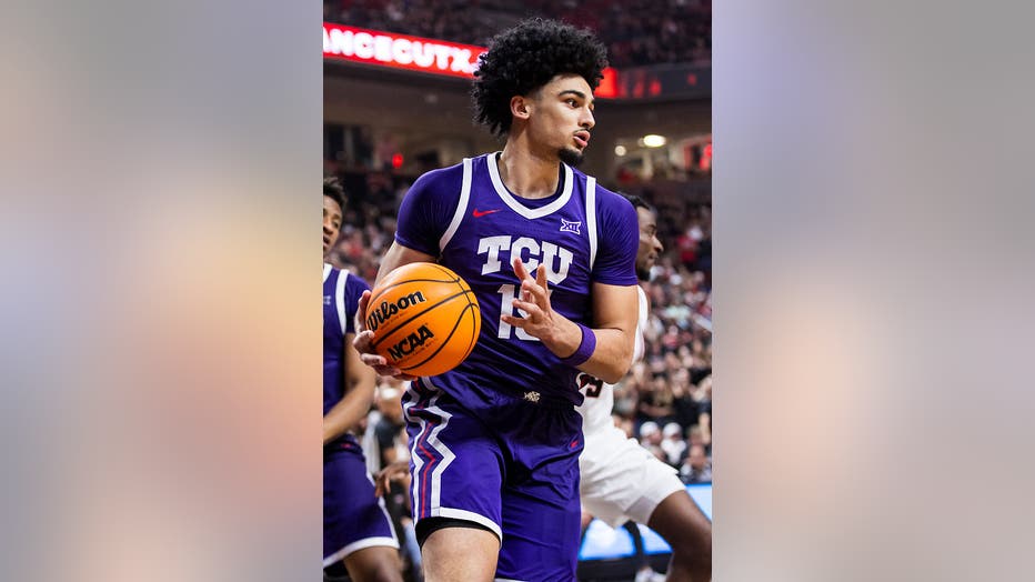 LUBBOCK, TEXAS - MARCH 03: David Punch #15 of the TCU Horned Frogs handles the ball during the first half of the game against the Texas Tech Red Raiders at United Supermarkets Arena on March 03, 2026 in Lubbock, Texas. (Photo by John E. Moore III/Get