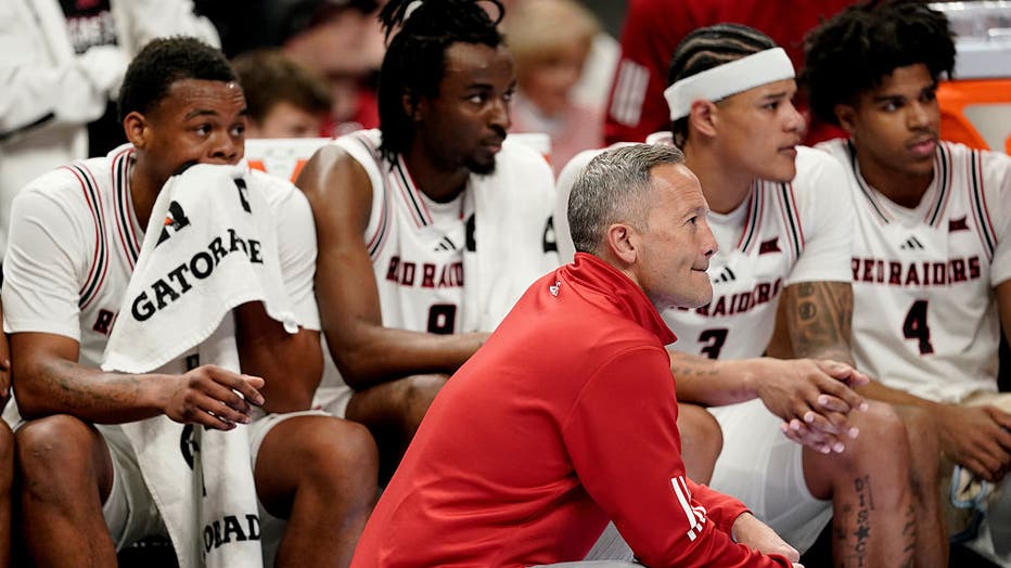 KANSAS CITY, MISSOURI - MARCH 12: Head coach Grant McCasland of the Texas Tech Red Raiders and players watch against Iowa State Cyclones in second half during the quarterfinals of the Big 12 Tournament at T-Mobile Center on March 12, 2026 in Kansas C