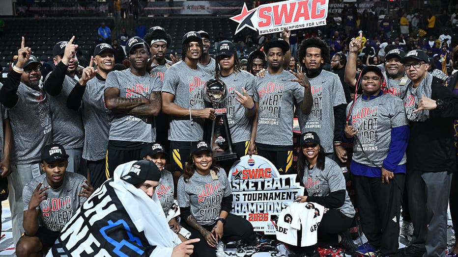 COLLEGE PARK, GEORGIA - MARCH 14: Members of the Prairie View A&M Panthers celebrate their team's 72-66 win over the Southern University Jaguars at the Southwestern Athletic Conference men's basketball tournament championship at Gateway Cente