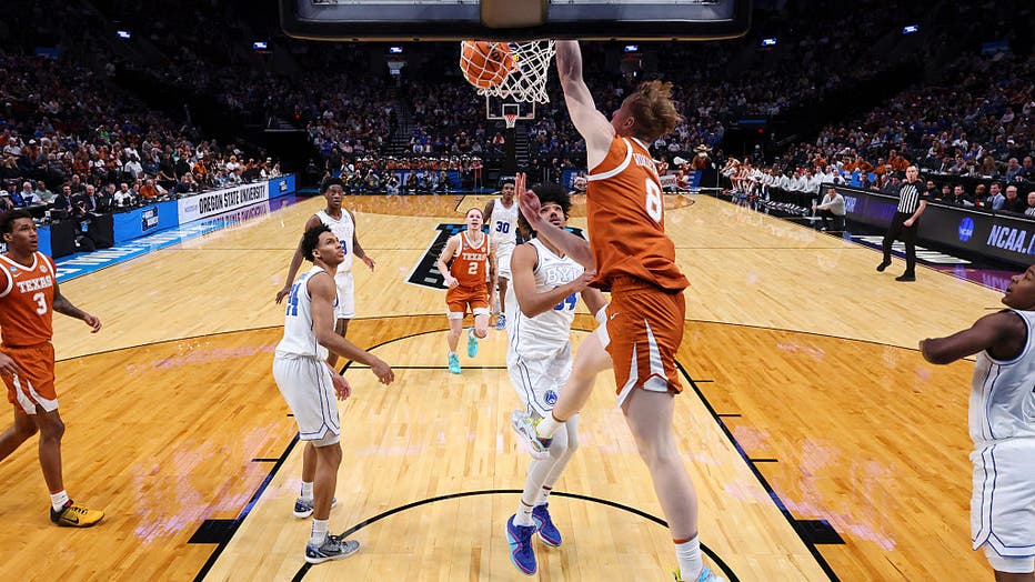 PORTLAND, OREGON - MARCH 19: Matas Vokietaitis #8 of the Texas Longhorns drives to the basket against the BYU Cougars during the first round of the 2026 NCAA Men's Basketball Tournament held at Moda Center on March 19, 2026 in Portland, Oregon. (Phot