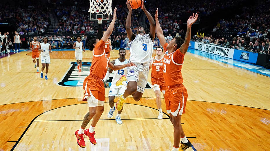 PORTLAND, OREGON - MARCH 19: AJ Dybantsa #3 of the BYU Cougars attempts a shot while being guarded by Simeon Wilcher #7 and Dailyn Swain #3 of the Texas Longhorns during the first half in the first round of the 2026 NCAA Men's Basketball Tournament a