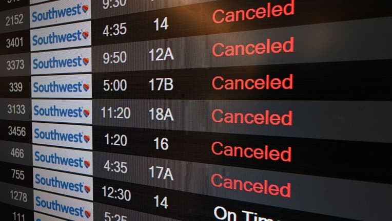 A digital display shows canceled flights in the Southwest Airlines luggage area, December 28, 2022. (Photo by Robyn BECK / AFP) (Photo by ROBYN BECK/AFP via Getty Images)