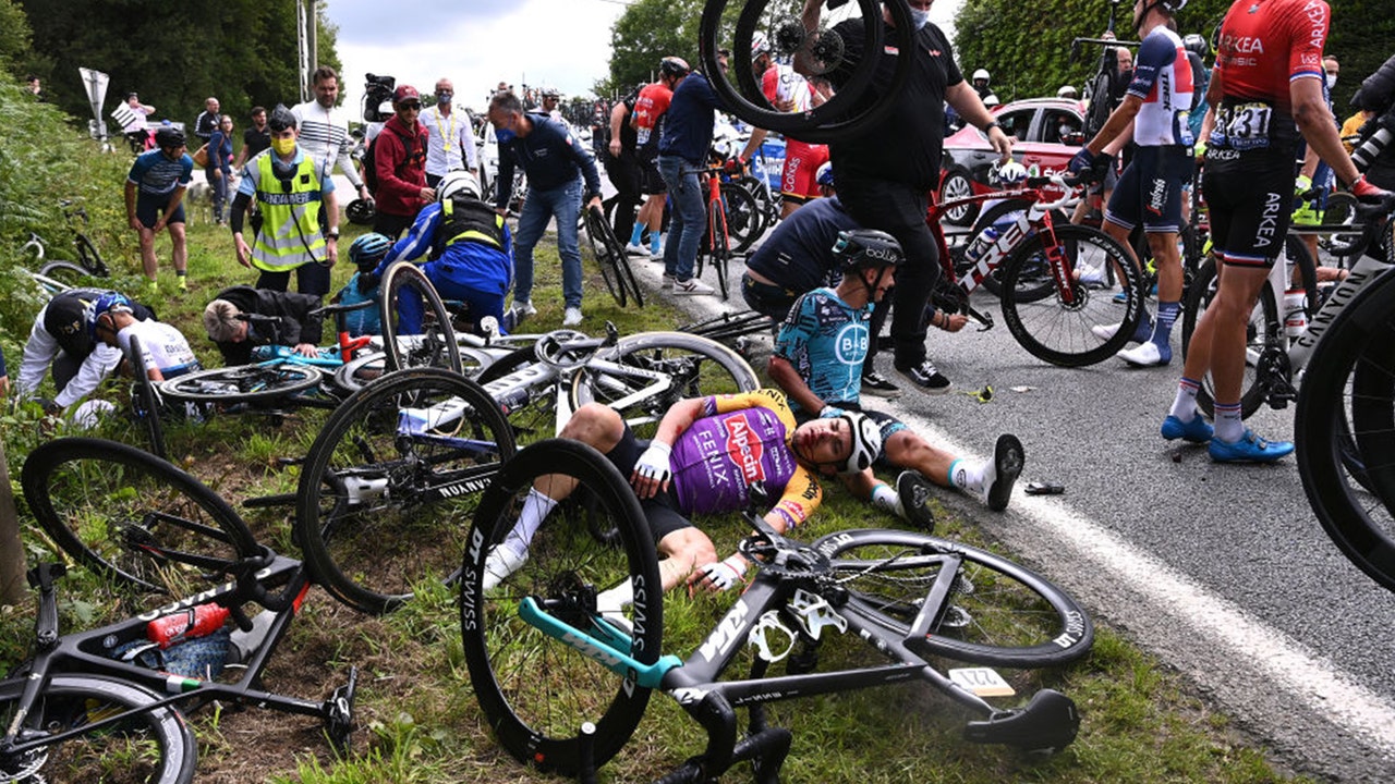 FILE - Several riders suffer injuries after a crash during the 108th Tour de France 2021, Stage 1 a 197,8km stage.