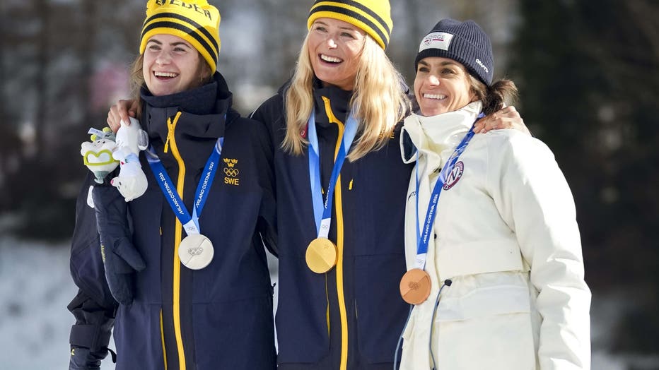 (L-R) Silver medalist Ebba Andersson of Sweden, Gold medalist Frida Karlsson of Sweden, Bronze Medalist Heidi Weng of Norway during the medal ceremony of the Women's 10km + 10km Skiathlon on day one of the Milano Cortina 2026 Winter Olympic games at