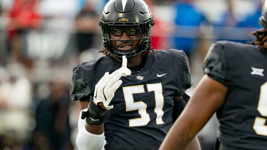 GAINESVILLE, FL - OCTOBER 05: UCF Knights defensive end Malachi Lawrence (51) during the game between the Florida Gators and the UCF Knights on October 5, 2024 at Ben Hill Griffin Stadium at Florida Field in Gainesville, Fl. (Photo by David Rosenblum