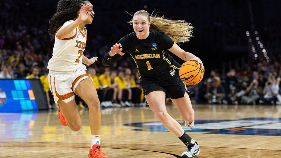 FORT WORTH, TEXAS - MARCH 30: Olivia Olson #1 of the Michigan Wolverines looks to drive in the Elite Eight round of the 2026 NCAA Women's Basketball Tournament game between the Michigan Wolverines and the Texas Longhorns at Dickies Arena on March 30,