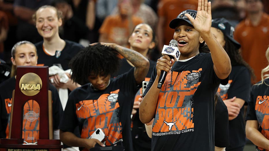 FORT WORTH, TEXAS - MARCH 30: Madison Booker #35 of the Texas Longhorns speaks to the crowd after beating the Michigan Wolverines 77-41 in the Elite Eight of the 2026 NCAA Women's Basketball Tournament at Dickies Arena on March 30, 2026 in Fort Worth