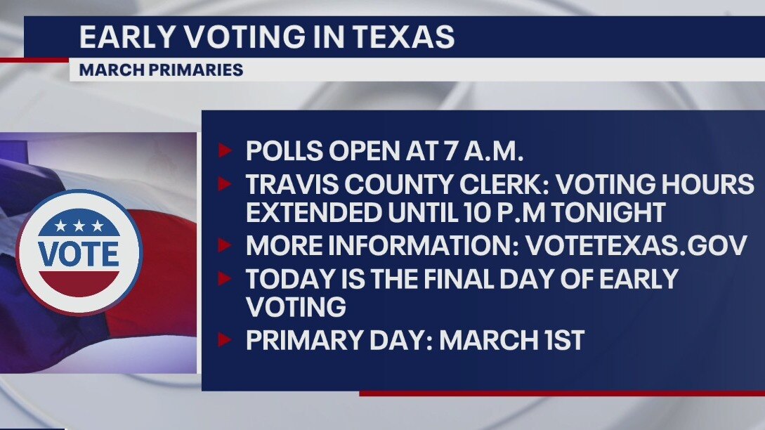 All polling locations in Travis County will be open until 10 p.m. for the last day of early voting.
