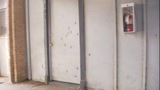 14 bullet holes smashed through a door and the wall next to it at Garden Villa Apartments on Sunday night.