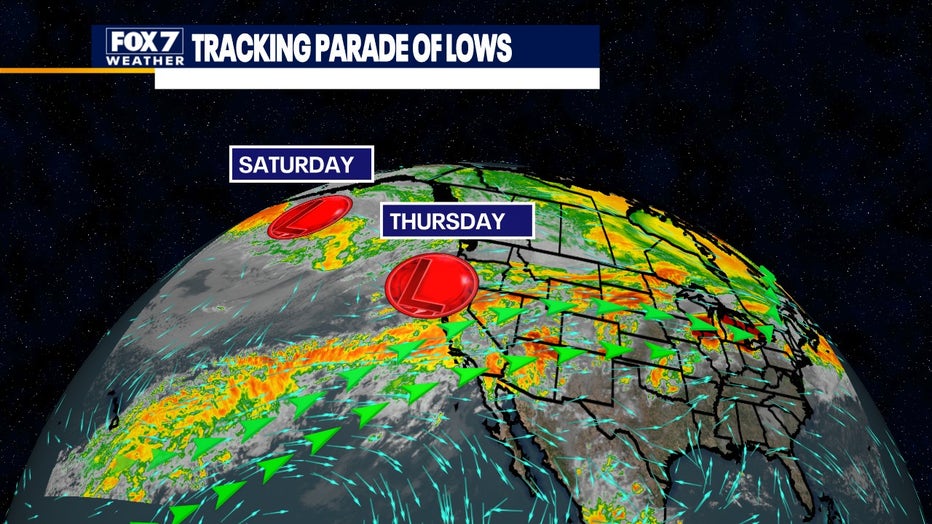 Meteorologists are tracking two Pacific lows that will ride the tropical flow into town.