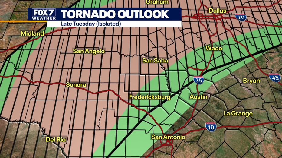 The prime spot for large hail, damaging winds and isolated tornadoes will happen from the Hill Country to West Texas.