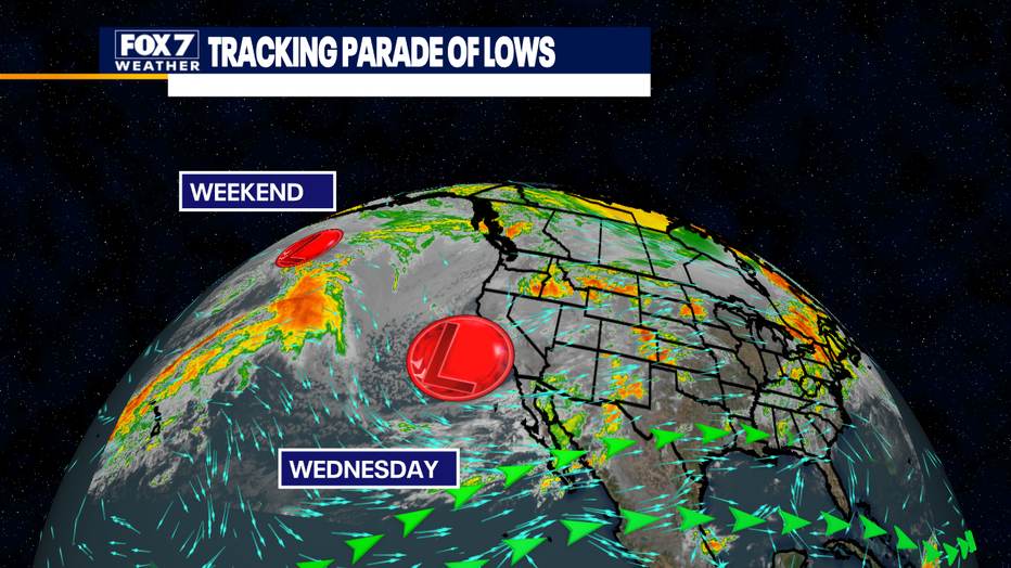 We are tracking two more Pacific lows which will help push the storms closer to us Wednesday and again on Saturday.
