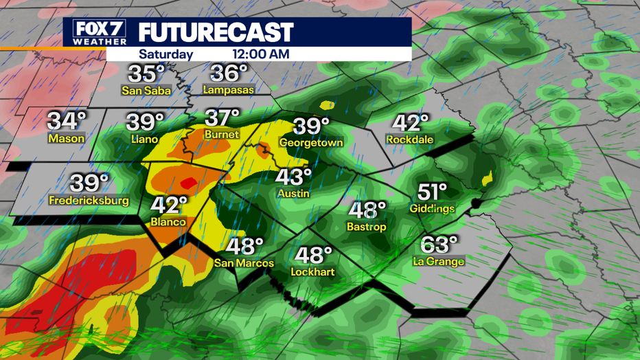 The cold front arrives Saturday morning setting the stage for falling temperatures and gusty winds.