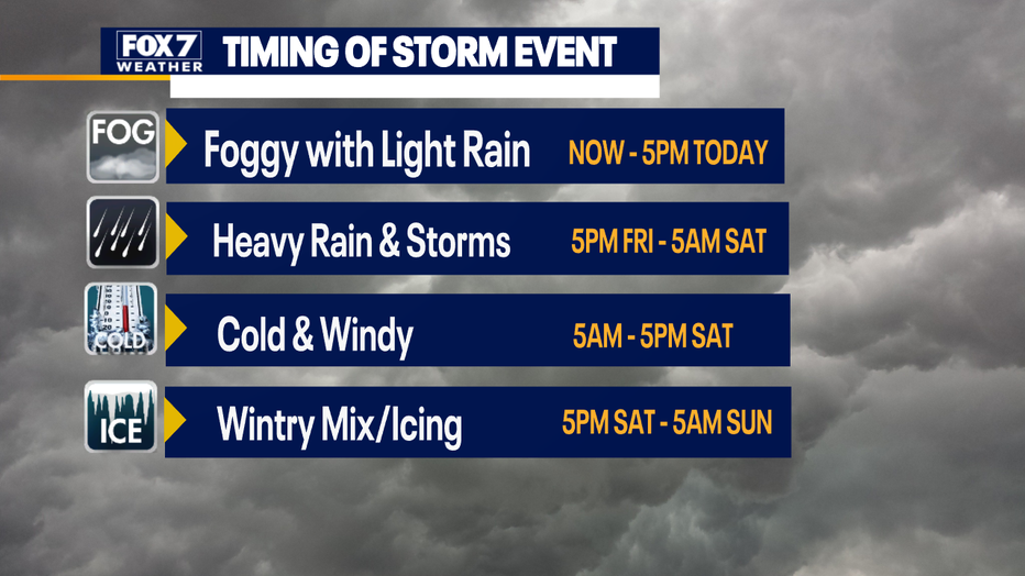 Today will be cloudy, foggy and mild with on and off light rain. Then the heavy rain and storms become likely and widespread overnight.