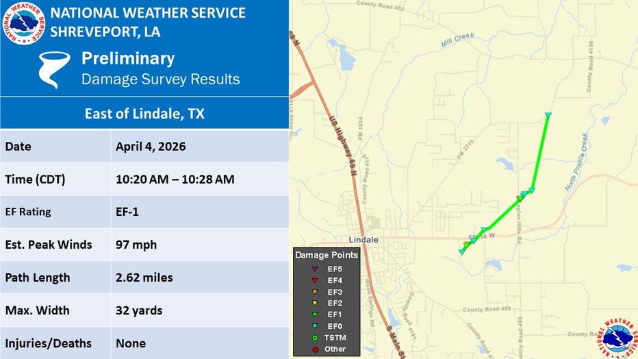 The National Weather Service in Shreveport confirmed that an EF1 tornado happened east of Lindale on the morning of April 4.